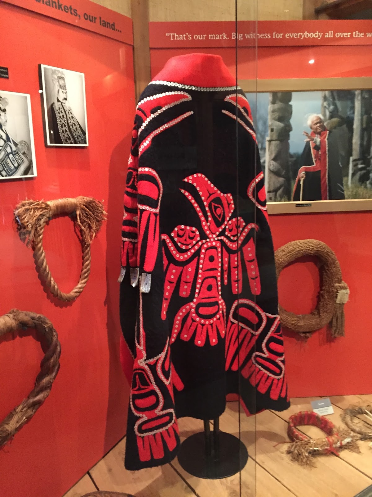 As we got into ‘Ksan RV park, it started raining more seriously— Larry took an umbrella out to hook up while I did the inside set-up. The girl at the desk of the RV park did not seem real sharp— assigned us to a spot that was inhabited already, so we drove to another one, and just let her know later. The rain lightened up and we went over to the ‘Ksan Historical Village and Museum right outside the RV park about 3:45. There was a tour scheduled at 3:30 that we missed, so we just walked around — then ran into the tour guide with another couple, and she said she would do another guided tour if we wanted. One other lady in the museum, who was a nurse from Vancouver, joined us. Our guide, Chrissy, was a First Nation aborigine, who has lived here her whole life. We got to go into several structures that were recreated in the 70’s, depicting the life of the Gitxsan Village — all the longhouses were made of red cedar— you could really smell the cedar entering each building. We got to go into 3 buildings where Chrissy played a CD, then answered our questions. One of the First Nation men pictured was her grandfather. We got to see a lot of the ceremonial masks, talking sticks, fancy capes with buttons, dried fish, abalone shells, + several totem poles on the outside of the buildings. The brochure says that the top figure on the totem is not the most important— it is the figure on the bottom that carries all the weight.